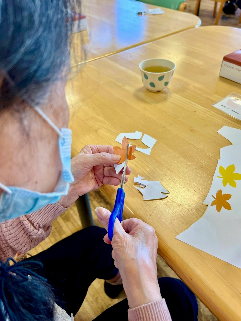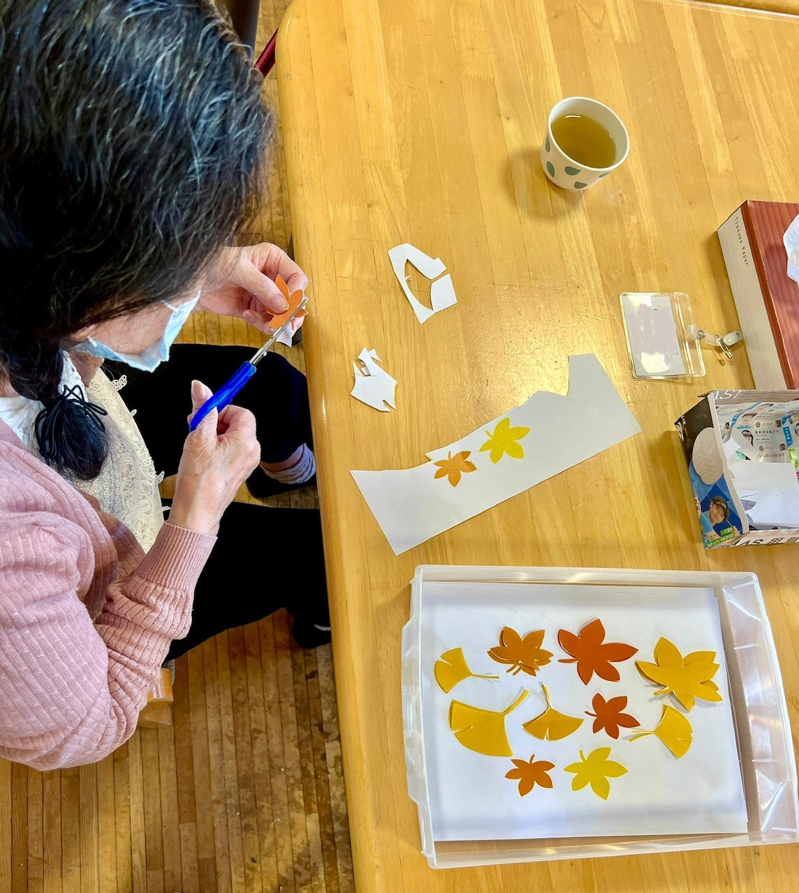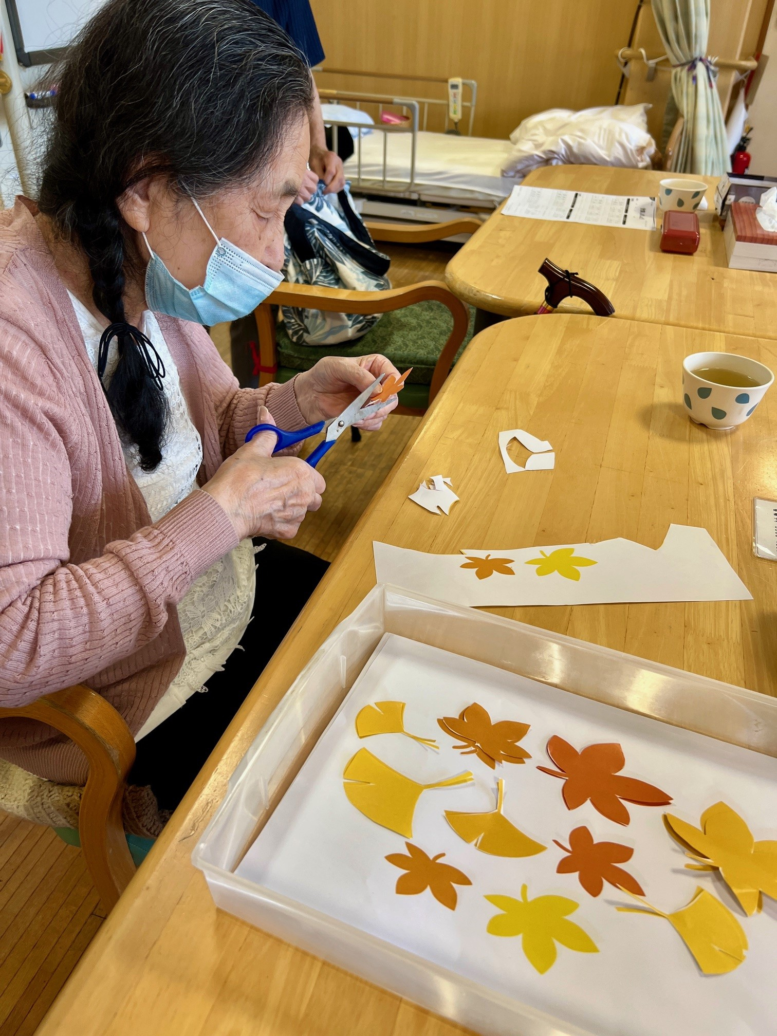 ですけれども、まずは折り紙の黄色、赤、茶色と本物の紅葉のようにたくさんの葉っぱを作ります。