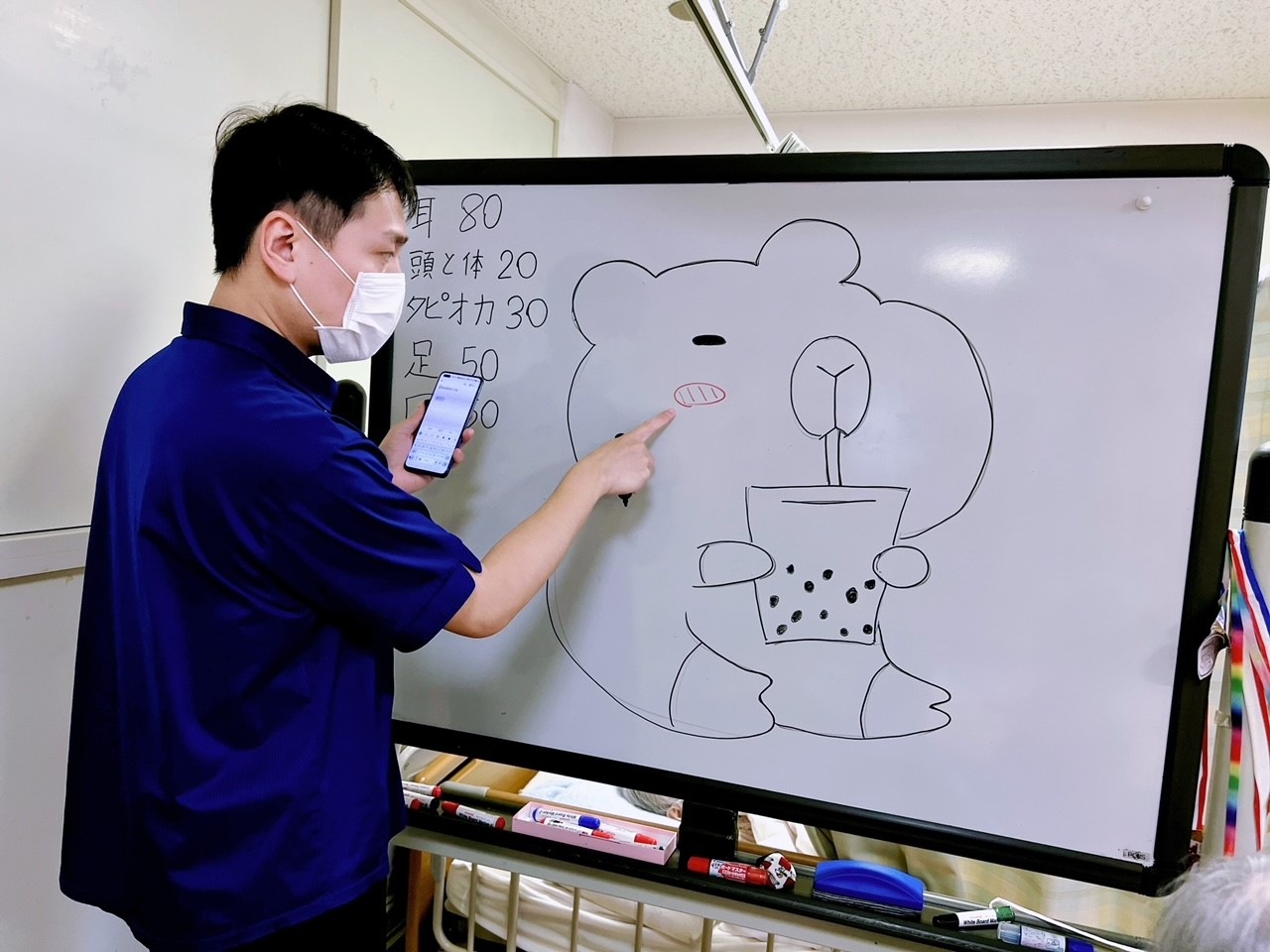 本日は皆様がご飯を食べた後に運動をしている時、トウフ職員が黒板に何かを描いているの見ました。