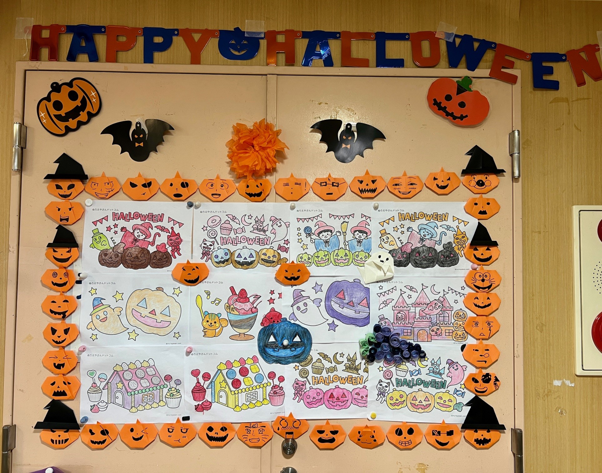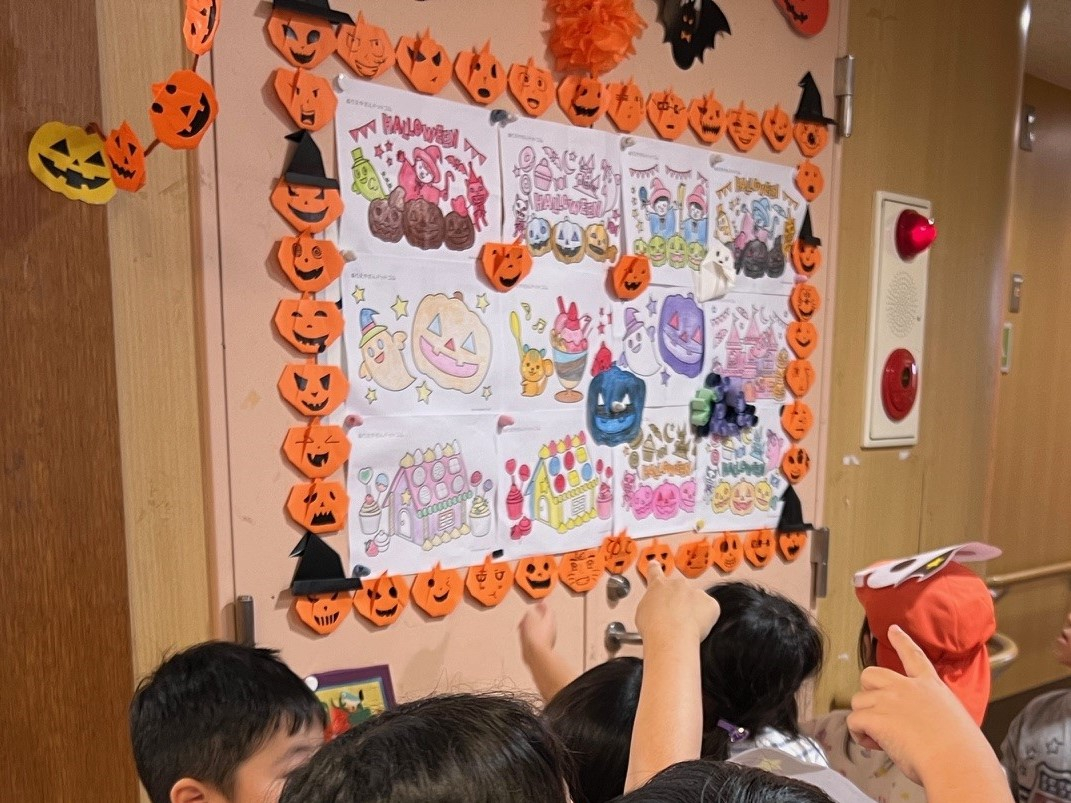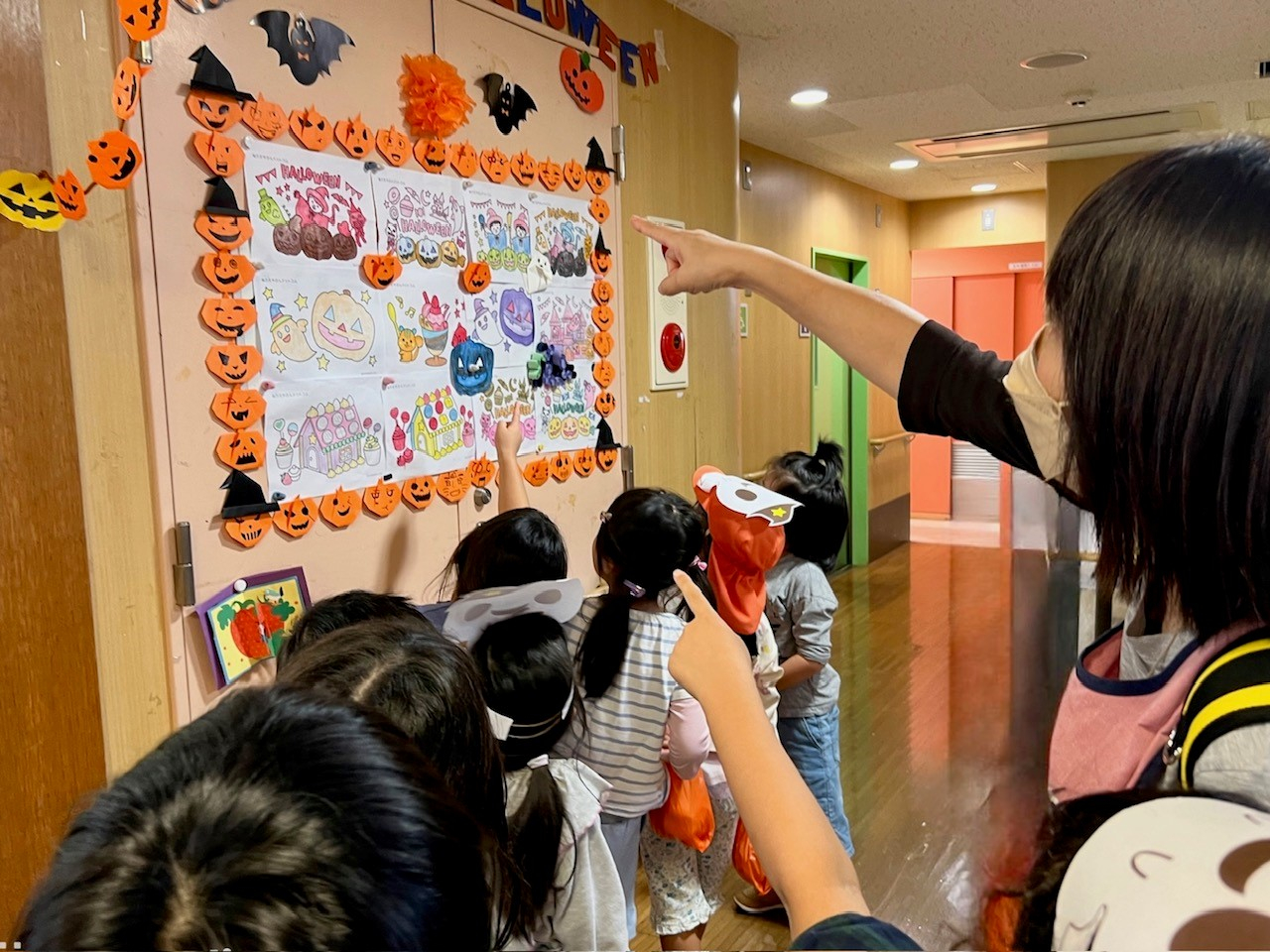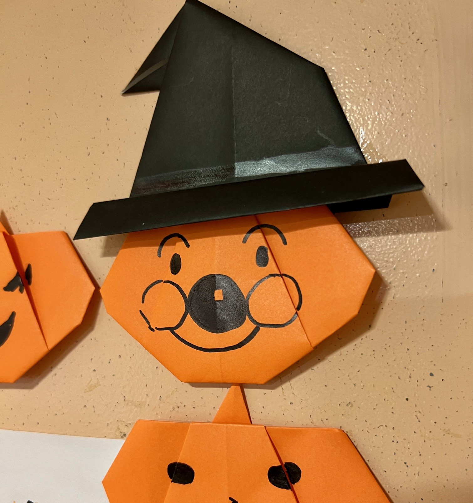 保育園に帰る為にエレベーターを待っていると、一人の子供が装飾されたトウフ職員のカボチャ折り紙に気づきました。