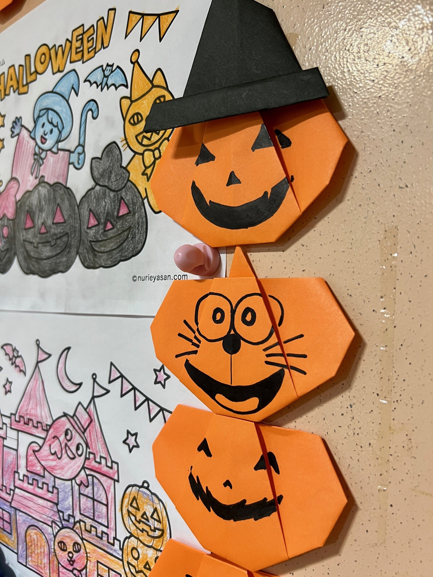 ですが、子供たち興味が一番引いたのは、袋いっぱいに入ったお菓子ではなく、さまざまな顔が描いたのカボチャ折り紙でした。