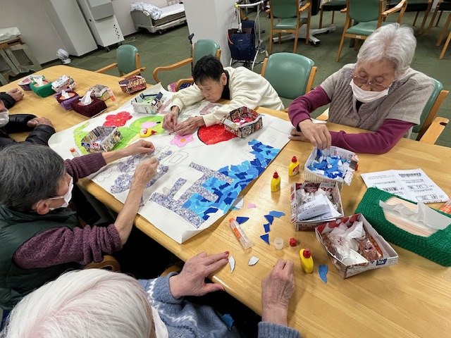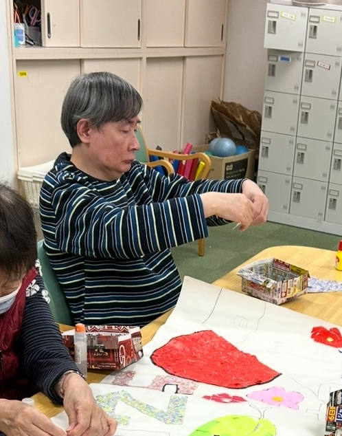 「貼る作業はちょっと、、、」というご利用者様には折り紙をびりびりに破いて頂く作業をお願いしました。