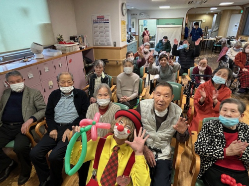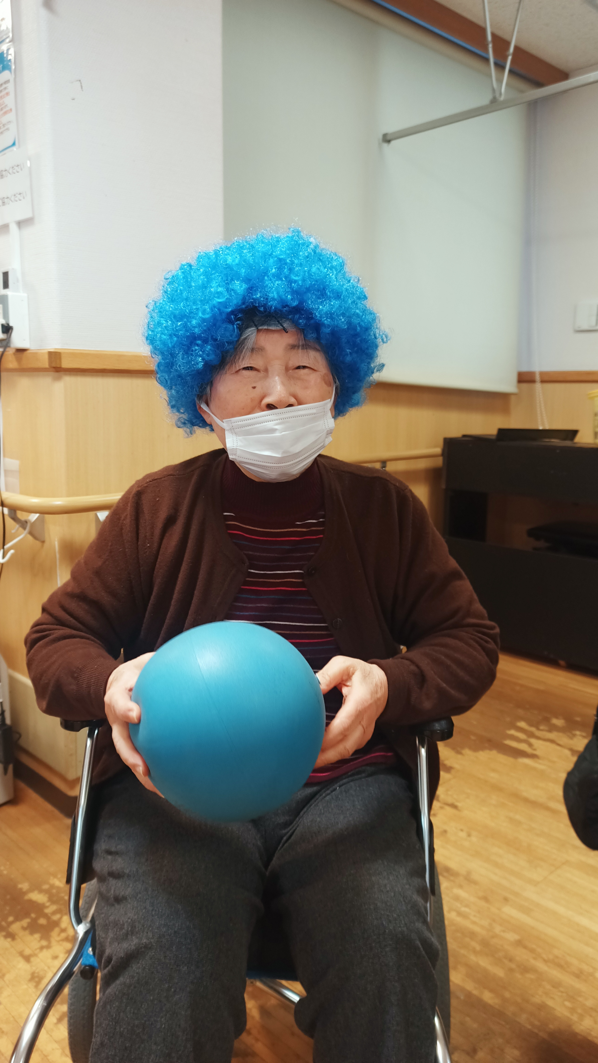 かつらをかぶってもにっこり笑顔のご利用者さま。