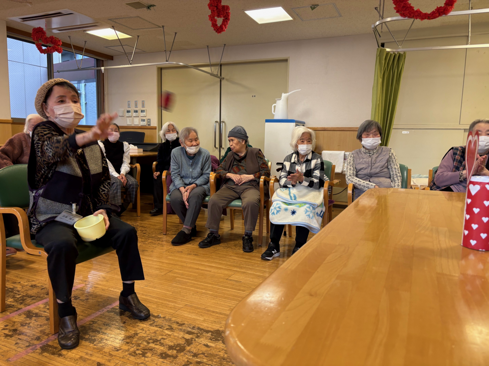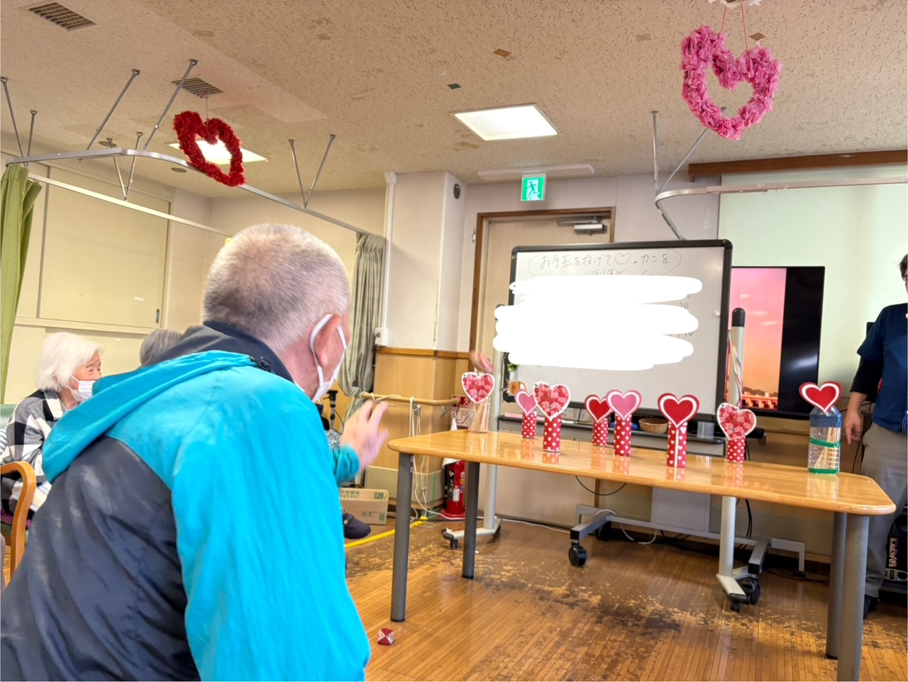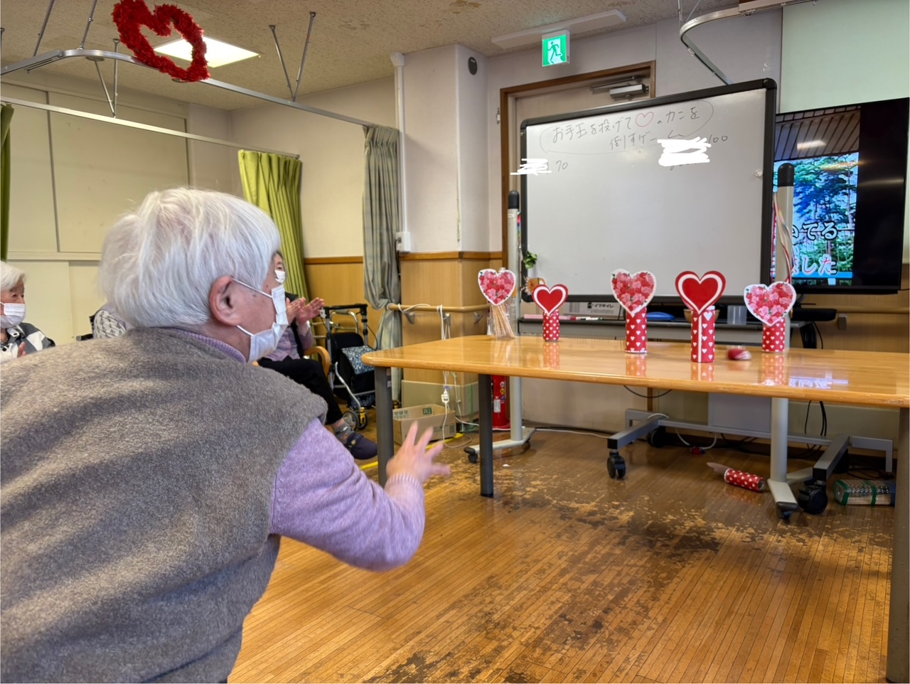 ハートの缶をめがけてお手玉を投げて、倒して得点を競い合います。