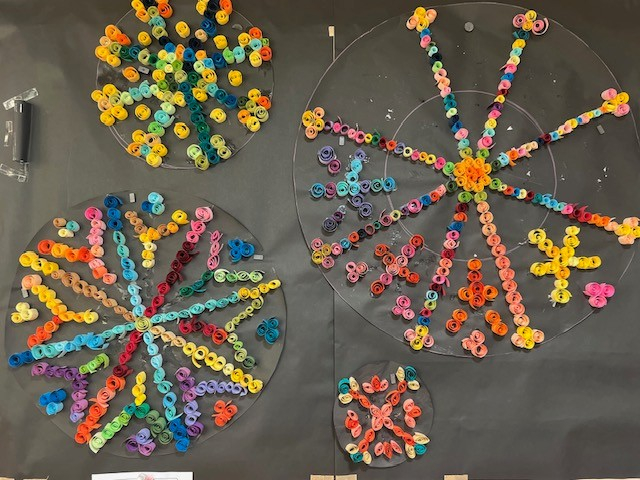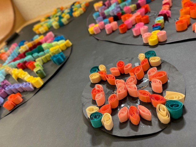折り紙をくるくる巻いて、一つひとつ丁寧に貼り合わせていく作業は時間も根気も必要でしたが、出来上がってみると壁いっぱいに広がる大きな花火となり、とても華やかです。
