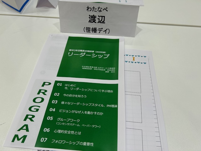 この定期研修は新卒職員が定期で行っている研修になります。今回の研修は「リーダーシップ」についての研修でした。