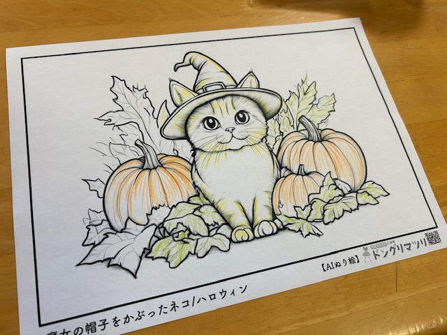 ハロウィンの塗り絵はかわいい猫が魔女帽子をかぶったもの、カボチャのお化け、幽霊の塗り絵の三種類をご用意致しました。