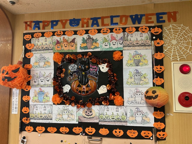 エレベーター前の一番目につく所に、ご利用者さまが色塗りしたハロウィンの塗り絵を飾らせていただきました♪