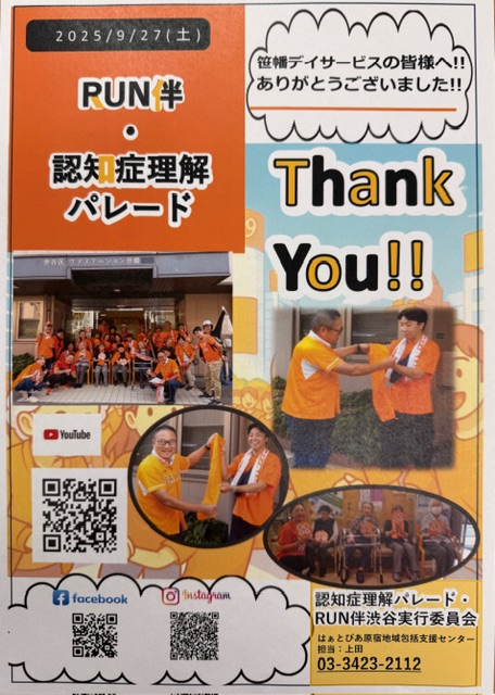 先月、笹幡デイサービスでは地域の皆様と一緒に「RUN伴・認知症理解パレード」 に参加させていただきました。