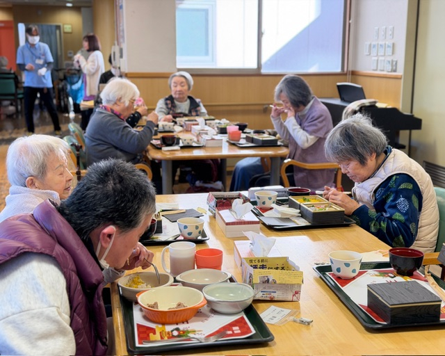「お正月のごちそう」お一人おひとり、ゆっくり箸を動かしながら、「やっぱりすき焼きはいいねぇ」「お正月らしくて嬉しいわ」