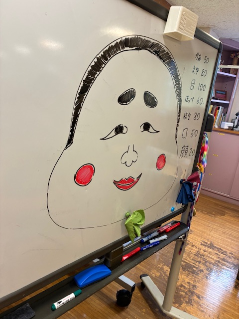 本日はホワイトボードに描かれたおたふくさんの的を狙って、バンダナを巻いた磁石を投げるダーツを行いました。おたふくさんの表情がとっても可愛らしいですね!