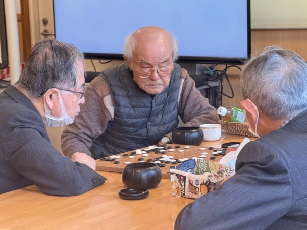 午後のフロアでは、男性利用者様たちが集まり、囲碁の対局が始まっていました。