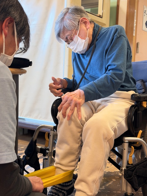 椅子に座った状態で足を前に伸ばしたり、ゴムバンドを使った運動など、