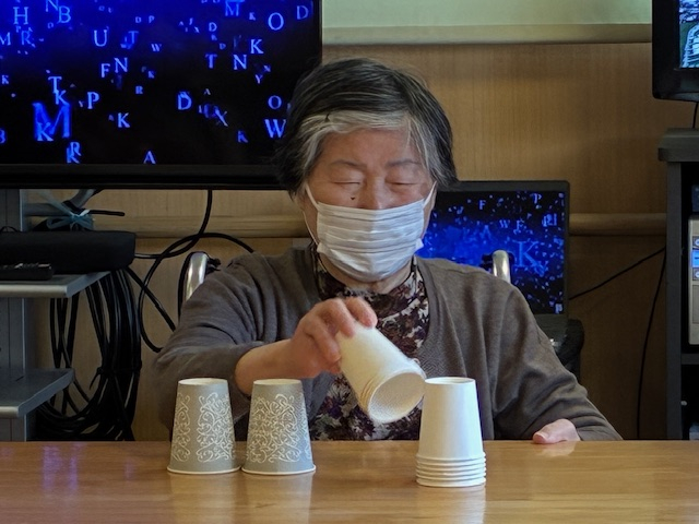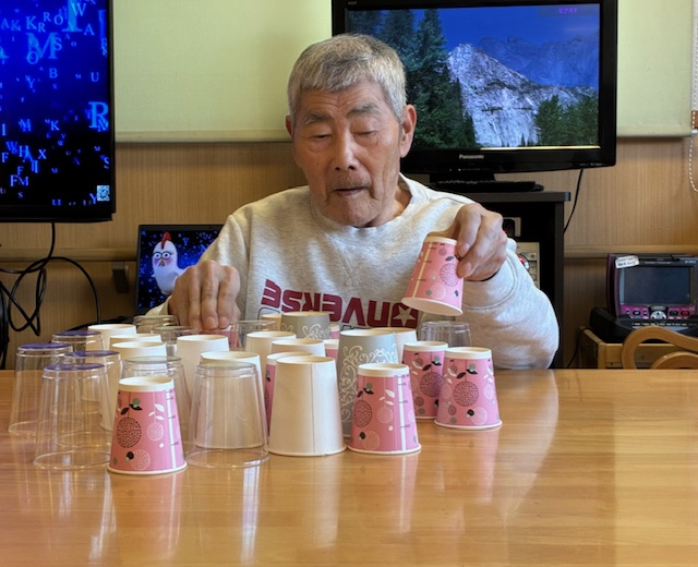 今回の紙コップを使ったレクリエーションのルールはシンプルで、同じ種類の紙コップを見つけて、どれだけ早く重ねられるかを競います。