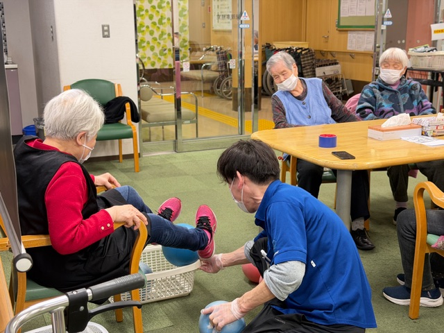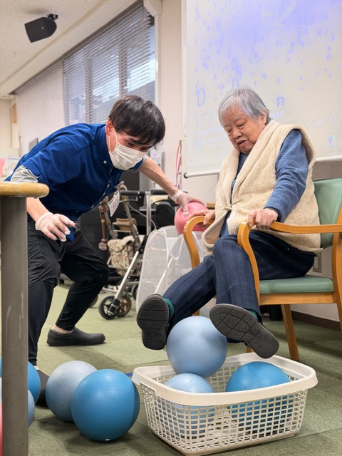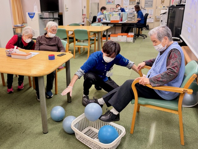 椅子に座ったまま、足を使ってボールを動かし、カゴの中に入れていく運動です。