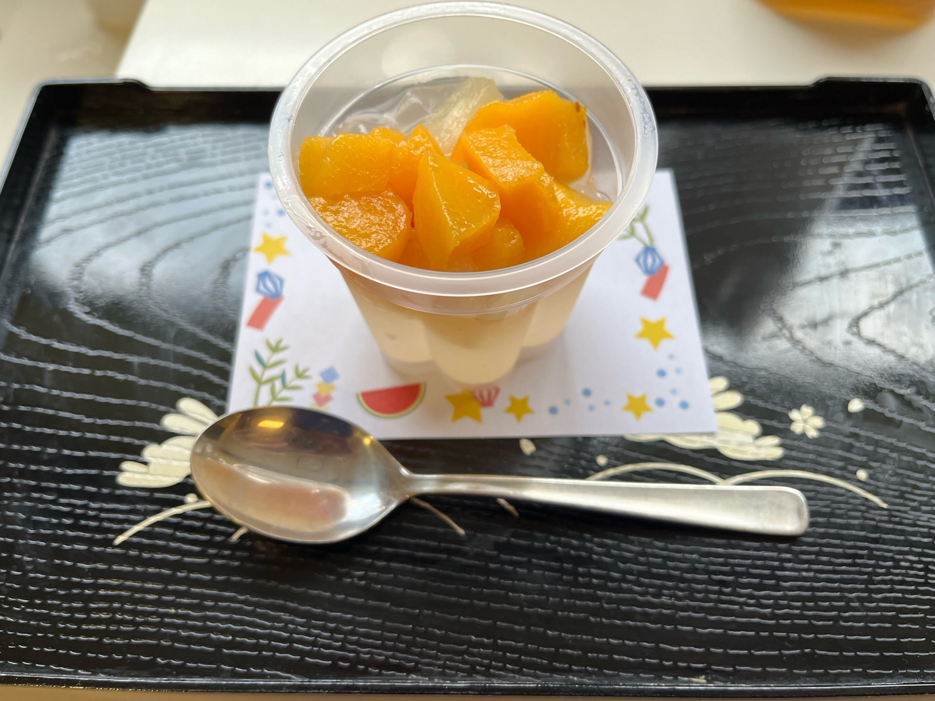 本日のお茶菓子は果物を上にのせたクラッシュゼリーとなっております。
