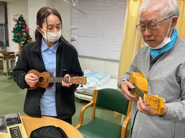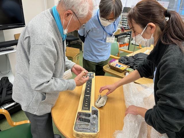 スチールギターも持ってきてくださり職員もめったに見れるものではないので興味津々です