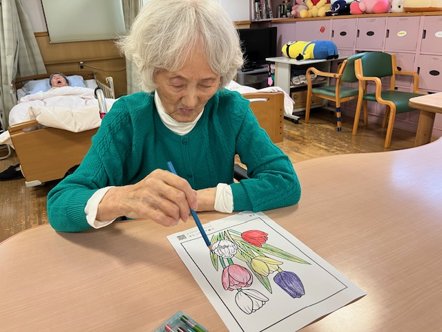うららフロアでは塗り絵は気軽にできて職員や利用者様にも人気があるので色々な塗り絵を準備しています