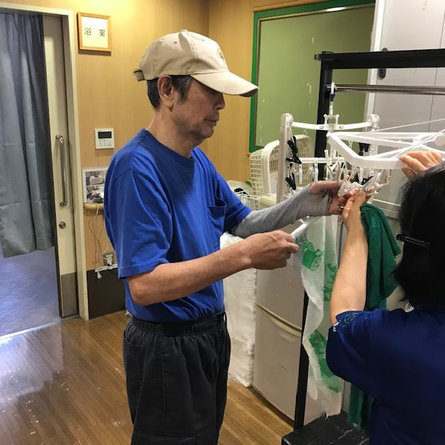 食器を拭く動作、洗濯を干す動作を一緒に行っていただきました。