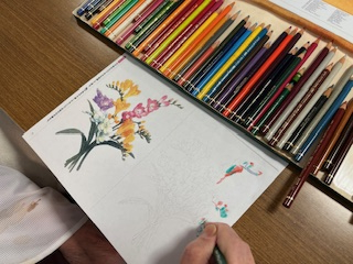 季節のイラストやお花の絵などお好きなものを選んでいただきそれぞれ思い思いに色を重ねていきます。