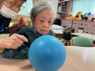 ボールを使うことで自然と腕や指先を動かすことができ、楽しみながら機能訓練に繋がる時間となりました