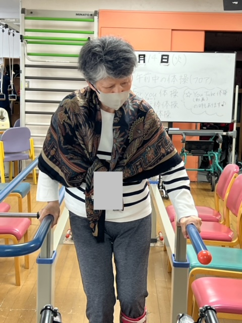 I.M様が平行棒体操で一生けん命に歩行訓練に励んでいる中、仲良しのN.M様が見守って下さっていました。