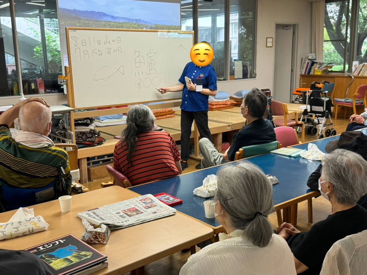 2024.08.11 デイサービス これ、な~んだ?? Tweet シェアする こんにちは、せせらぎデイサービスの郷です。 ホワイトボードに書いてある文字は何て読むのでしょう?? 皆さん頭を抱えながらいっぱい悩んでいました♪ 前の記事 2024.08.11 デイサービス 富士山ゼリー 次の記事 2024.08.07 デイサービス 激闘!?棒倒し 一覧へ戻る