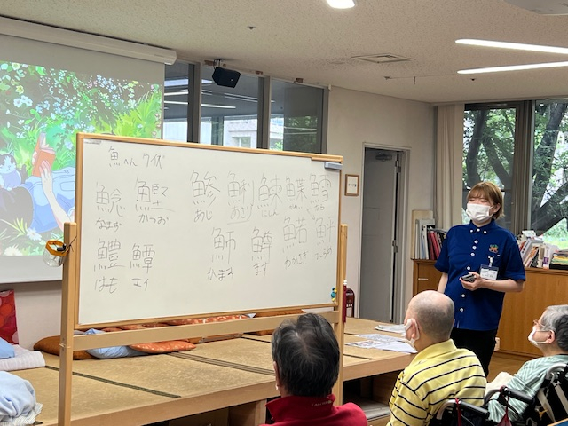 新しく入った山口職員、脳トレの時間に魚ヘンの漢字クイズを利用者様の皆さんに紹介していました!