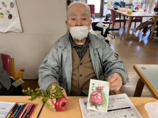 2024.11.09 認知症デイサービス お見事! Tweet シェアする いつも素敵な絵を描いて下さる利用者様。今日は絵手紙に挑戦です。 葉書を使い、その枠の中に対象物を描くという難しい作業。 結果はこの通り。画面の中には立派なザクロが姿を表しました! 前の記事 2024.11.10 認知症デイサービス これが作品です 次の記事 2024.11.09 認知症デイサービス 立冬の昼食 一覧へ戻る