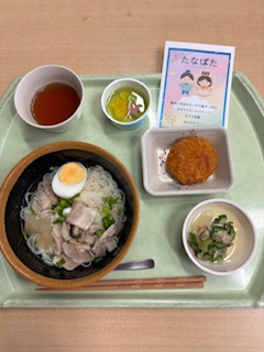 七夕の日の昼食は、「豚肉と冬瓜のぶっかけ塩そーめん」を中心に、「ホタテクリームコロッケ」「オクラ豆腐」