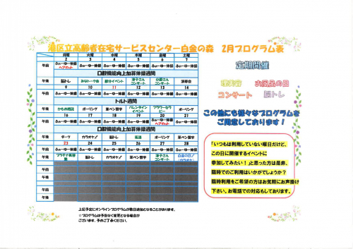2026.02.12 NEW 2月の献立表 お知らせ #奉優会 #イベント 2026.02.09 NEW 2月の献立表 活動報告 #奉優会 #デイサービス #レクリエーション #イベント 2026.02.05 2月のプログラム表 お知らせ #介護 #イベント 2026.01.30 【初詣外出】白金氷川神社で気持ちを込めてご参拝。 活動報告 #港区 #白金の森デイサービス #初詣 #外出企画 #白金氷川神社 #ご縁 #お賽銭 2026.01.30 季節感も値段感も感じながら脳トレチラシクイズ☆ 活動報告 #港区 #白金の森デイサービス #レク #チラシクイズ #脳トレ 2026.01.28 【節分準備】ご利用者を笑顔にする「鬼の折り紙」☆ 活動報告 #港区 #白金の森デイサービス #折り紙 #鬼の顔 #節分 2026.01.22 「白金の日」はビールにカラオケ!これで決まり☆ 活動報告 #港区 #白金の森デイサービス #白金の日 #湯上りビール #ドリンク飲み放題 #カラオケ大会 #デュエット 2026.01.19 【プラチナ美容塾】「あ~気持ちいい!爪だけ二十代(笑)」☆ 活動報告 #港区 #白金の森デイサービス #ボランティア #ハンドマッサージ #ネイルケア #プラチナ美容塾 2026.01.17 【昭和歌謡コンサート】寒い季節にも淳子先生のホットな歌声☆ 活動報告 #港区 #白金の森デイサービス #ボランティア #昭和歌謡コンサート 2026.01.16 【試食会】お弁当対応に向けてオペレーションを細かくチェック☆ 活動報告 #港区 #白金の森デイサービス #試食 #お弁当 2026.01.16 【介護美容】ケアビューティストを招いて「キレイになること」を楽しんで☆ 活動報告 #港区 #白金の森デイサービス #介護美容 #ケアビューティスト #ケアメイク #ケアネイル 2026.01.15 【野ばらの会】ピアノとバイオリンの生演奏でパワフルな歌会☆ 活動報告 #港区 #白金の森デイサービス #ピアノ #バイオリン #生演奏 2026.01.12 【ボランティア】朗読&ハーモニカ生演奏でハートフルなひととき☆ 活動報告 #港区 #白金の森デイサービス #ボランティア #朗読 #ハーモニカ演奏 2026.01.09 【ボランティア】干支にちなんだ演目がならんだ「新春落語会」☆ 活動報告 #港区 #白金の森デイサービス #ボランティア #落語 #干支 2026.01.08 【節分イベント】節分準備は鬼に金棒!? 活動報告 #港区 #白金の森デイサービス #節分 #鬼に金棒 #イベント準備 1 2 3 … 37