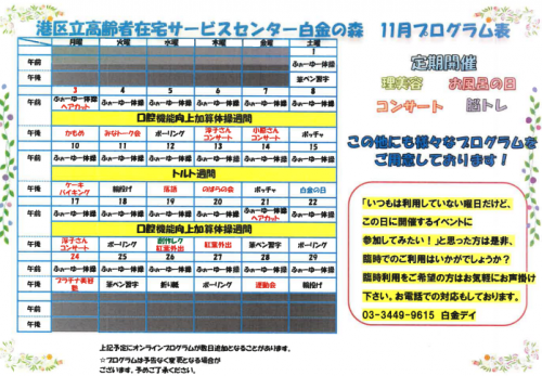 2025.12.03 12月のプログラム表 お知らせ #港区 #白金の森デイサービス #イベント #ボランティア #12月のプログラム 2025.12.01 今年も事例研究発表会に出席してきました…! 活動報告 #奉優会 #デイサービス #レクリエーション #福祉 #イベント #事例研究発表会 2025.12.01 12月の広報誌 お知らせ #港区 #白金の森デイサービス #イベント #お知らせ 2025.11.24 【イベント準備】運動会に向けてタコが豊漁!? 活動報告 #港区 #白金の森デイサービス #イベント #運動会 #準備 #万国旗 #タコ 2025.11.10 【イベント】「甘いものは別腹!」ケーキバイキング☆ 活動報告 #港区 #白金の森デイサービス #ケーキバイキング #イベント 2025.11.03 11月のプログラム表 お知らせ #港区 #白金の森デイサービス #イベント #11月のプログラム #ボランティア 2025.11.01 11月イベントのお知らせ お知らせ #港区 #白金の森デイサービス #イベント #紅葉ドライブ #ケーキバイキング #運動会 #11月お知らせ 2025.11.01 11月の広報誌 お知らせ #港区 #白金の森デイサービス #広報誌 #イベント #お知らせ 2025.10.31 秋の一大イベント 活動報告 #奉優会 #デイサービス #レクリエーション #イベント #港区 2025.10.16 【レク】ぼっちゃでテーブル対抗! 活動報告 #奉優会 #デイサービス #レクリエーション #介護 #イベント #ボッチャ 2025.10.16 【出前弁当】秋香る松茸ご飯と手まり寿司 活動報告 #奉優会 #レクリエーション #介護 #福祉 #イベント #出前弁当 2025.10.13 【かもめ朗読会】「椰子の実」「ここに幸あり」ほか 活動報告 #奉優会 #デイサービス #レクリエーション #介護 #福祉 #イベント #かもめ朗読会 2025.10.10 【フラワーセラピー】かぼちゃのバスに乗って… 活動報告 #レクリエーション #福祉 #イベント #フラワーセラピー 2025.10.04 【ハロウィン】イベント本番に向けて、ご利用者と一緒に楽しく準備☆ 活動報告 #港区 #白金の森デイサービス #ハロウィン #イベント 2025.10.01 10月のプログラム表 お知らせ #奉優会 #レクリエーション #福祉 #イベント #プログラム表 1 2 3 … 13