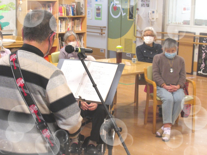 2024.02.02 活動報告 小原様コンサート Tweet シェアする ボランティアの小原様によるコンサートが開催! 皆さん馴染みの曲をギター演奏を交えながら披露して下さいました。 じっくり聞く方、歌詞カードを見ながら一緒に歌う方、皆さん思い思いに楽しんでいらっしゃいました。 次回の開催も楽しみにお待ちしております。 #デイサービス #福祉 #奉優会 #イベント #ボランティア #港区 前の記事 2024.02.03 活動報告 鬼退治 大成功! 次の記事 2024.02.01 活動報告 【プラチナロード便り】2024年2月号 一覧へ戻る