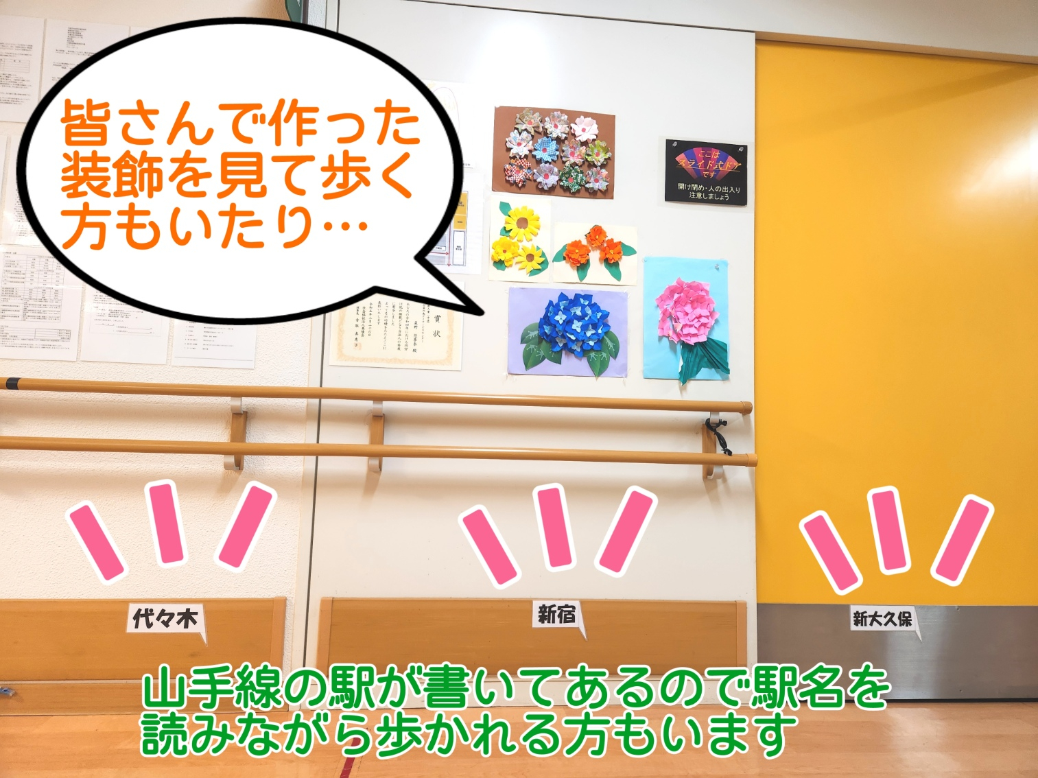 皆さんで作成した装飾を飾ったりして、目で楽しみながら歩いて頂いています。