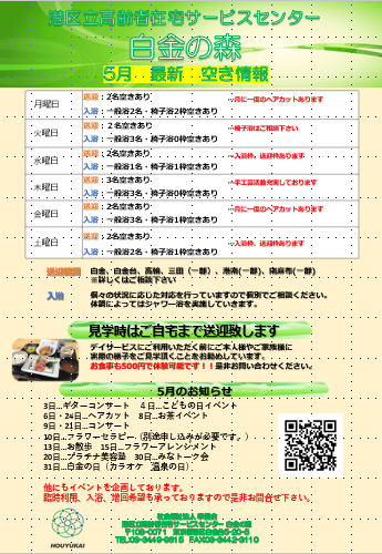 2024.04.30 お知らせ 5月空き情報更新 Tweet シェアする 5月空き状況更新しました。 見学・体験等いつでもご連絡ください。 お待ちしております! #港区 #白金の森デイサービス #5月空き情報 #臨時利用 前の記事 2024.04.30 お知らせ 5月イベントのお知らせ 次の記事 2024.04.29 お知らせ 【白金の日】後編 カラオケリレー! 一覧へ戻る