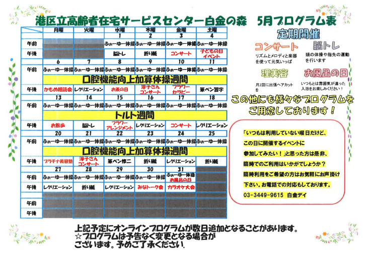 2024.05.02 お知らせ 5月のプログラム Tweet シェアする 白金の森デイサービス5月のプログラム表を更新しました! #港区 #白金の森デイサービス #5月のプログラム #ボランティア #レクリエーション 前の記事 2024.05.04 お知らせ 鯉尽くし 次の記事 2024.05.01 お知らせ 白金の森デイサービスの床がピッカピカ! 一覧へ戻る
