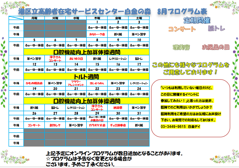 2024.07.24 お知らせ 8月のプログラム Tweet シェアする 白金の森デイサービス8月のプログラム表を更新しました! #港区 #白金の森デイサービス #8月プログラム #イベント #ボランティア #レクリエーション #コンサート #ハンドマッサージ #ネイルケア 前の記事 2024.07.25 お知らせ 8月イベントのお知らせ 次の記事 2024.07.22 お知らせ 8月空き情報更新 一覧へ戻る