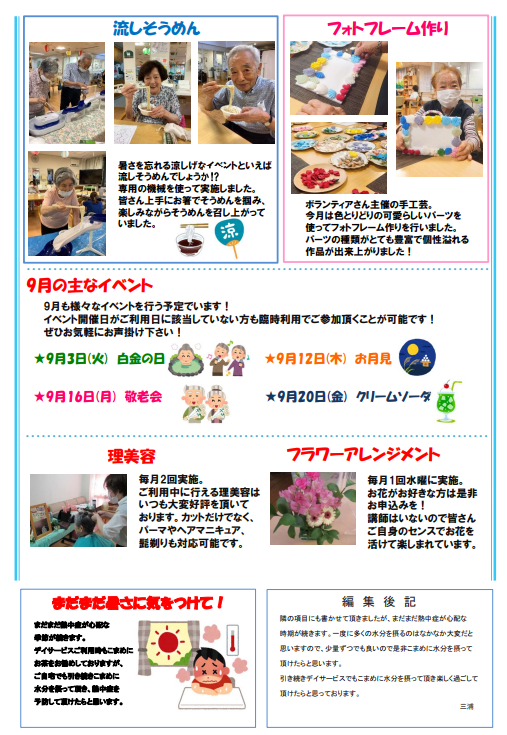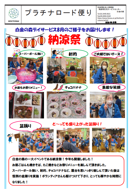 2024.09.02 お知らせ プラチナロード便り2024年9月号 Tweet シェアする プラチナロード便り2024年9月号をアップしました! #港区 #白金の森デイサービス #広報紙 #プラチナロード便り #ボランティア #イベント 前の記事 2024.09.02 お知らせ 9月の献立表 次の記事 2024.08.30 お知らせ 【ボランティア】チェロの音色とオリジナルクイズ。 一覧へ戻る