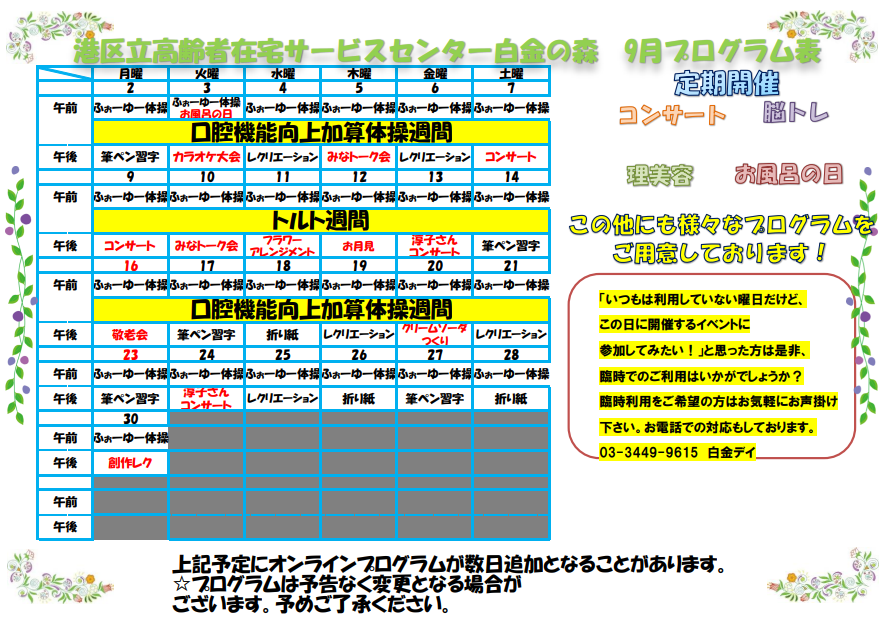 2024.09.04 お知らせ 9月のプログラム Tweet シェアする 白金の森デイサービス8月のプログラム表を更新しました! #港区 #白金の森デイサービス #9月プログラム #イベント #ボランティア #レクリエーション #コンサート #ハンドマッサージ #ネイルケア 前の記事 2024.09.06 お知らせ 【フラワーセラピー】10月の開催日決定! 次の記事 2024.09.03 お知らせ 9月空き情報更新 一覧へ戻る