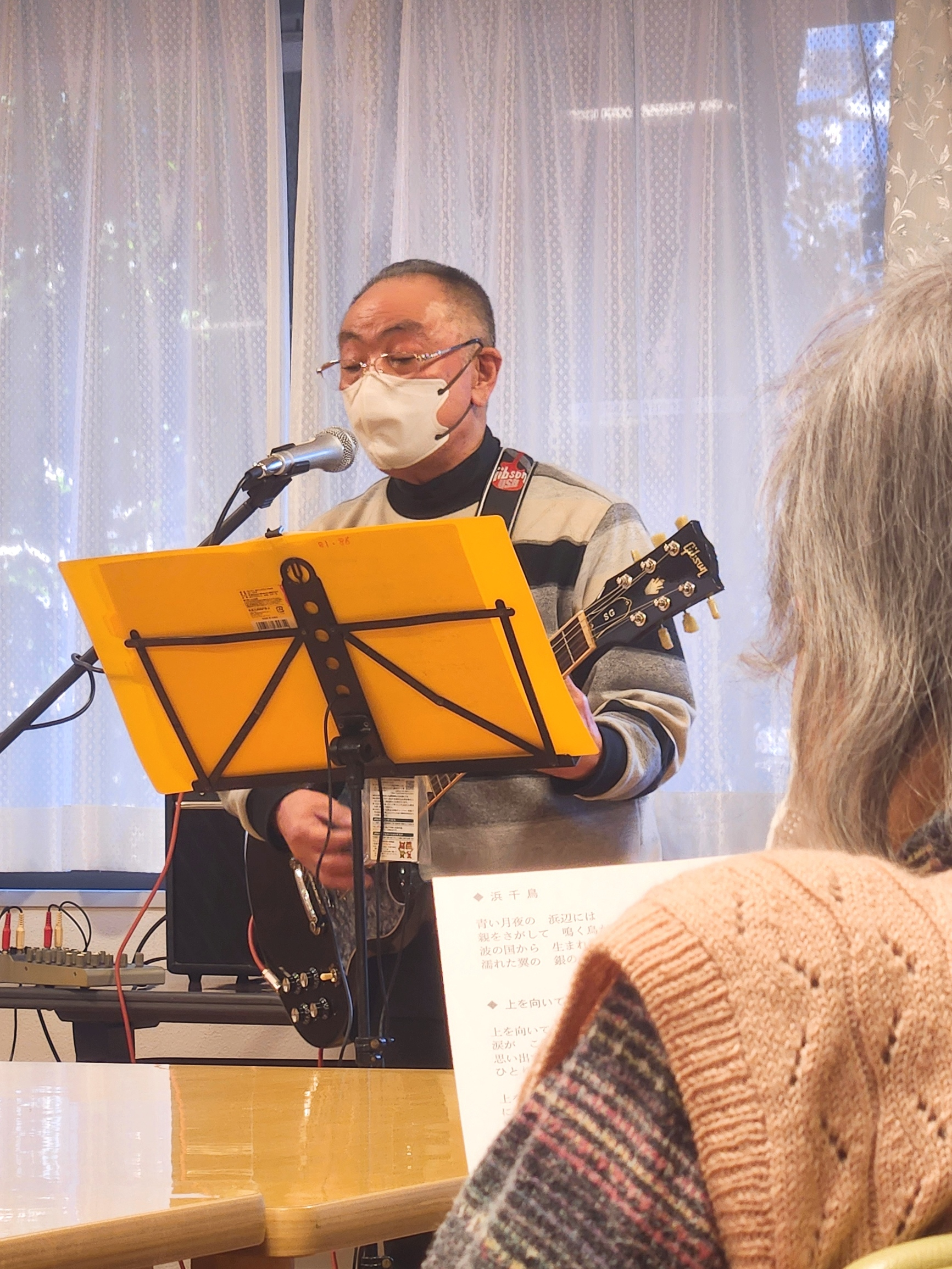 まずは小原さんのギター演奏と歌声を鑑賞。馴染みの曲や懐かしい曲をたくさん楽しまれました。