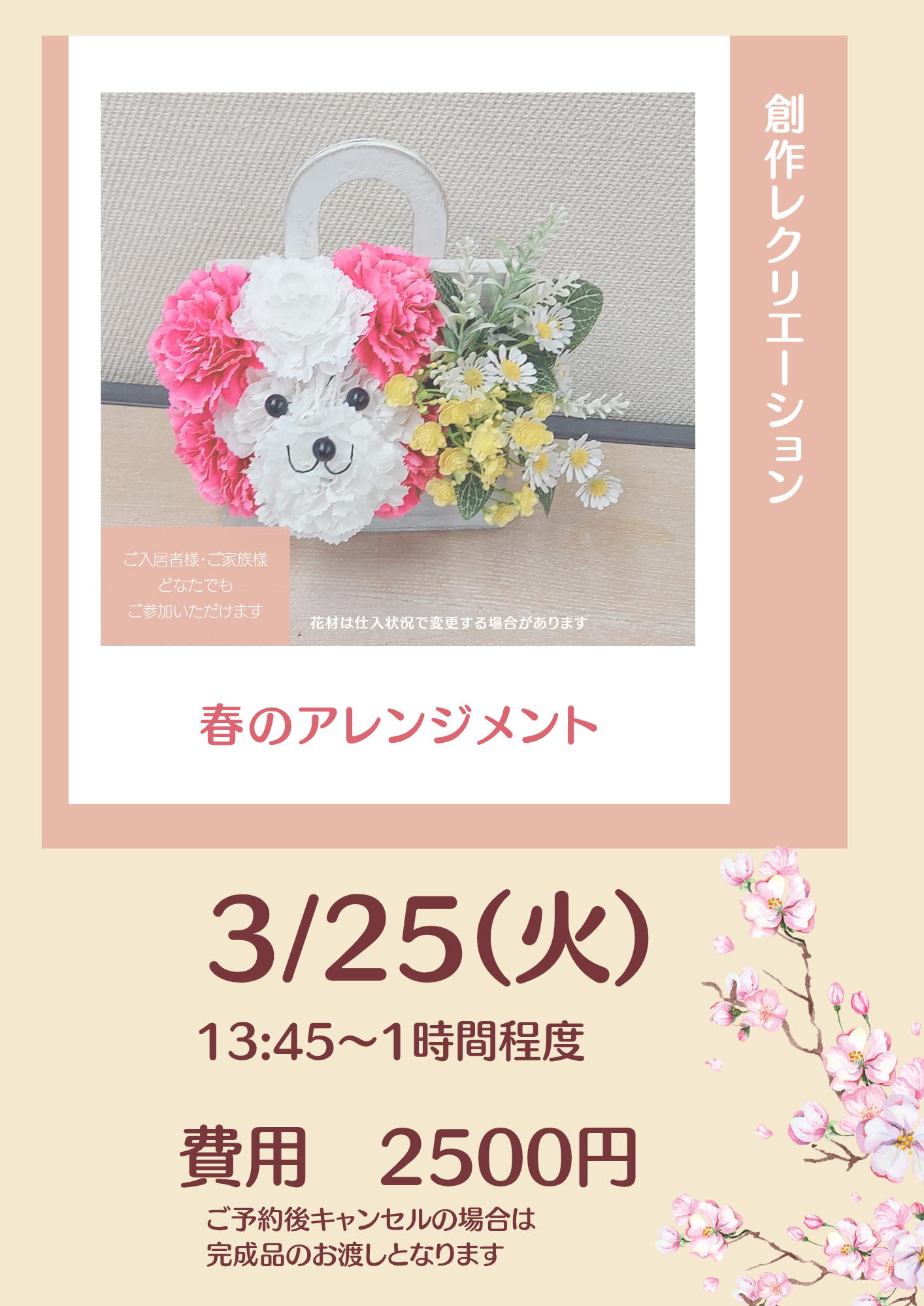 2025.03.18 お知らせ 創作レクリエーションのお知らせ Tweet シェアする 来週25日は、創作レクリエーションの日です! 今回は、春らしいお花とかわいいワンちゃんのお顔がついた作品♪お楽しみに!! Y.H #デイサービス #レクリエーション #介護 #福祉 #イベント #創作レクリエーション 前の記事 2025.03.19 お知らせ 【ボランティア】中村式ハッピー教室「指は第2の脳。指を動かしましょう! 次の記事 2025.03.17 お知らせ 【旅するランチ】北海道「ちゃんちゃん焼き」 一覧へ戻る