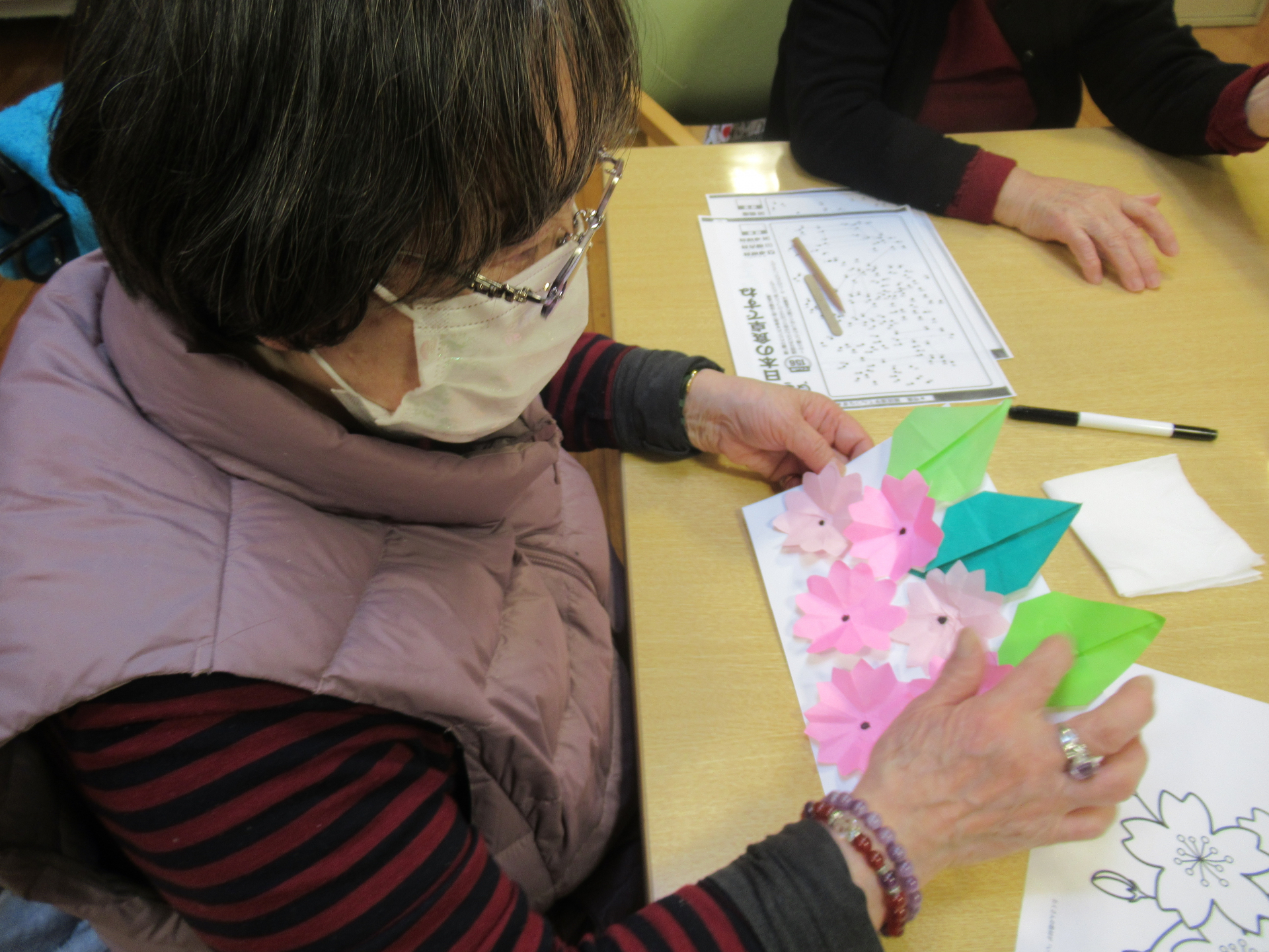 折り紙でさくらの花と葉っぱを作り、台紙に貼り付ける作業は