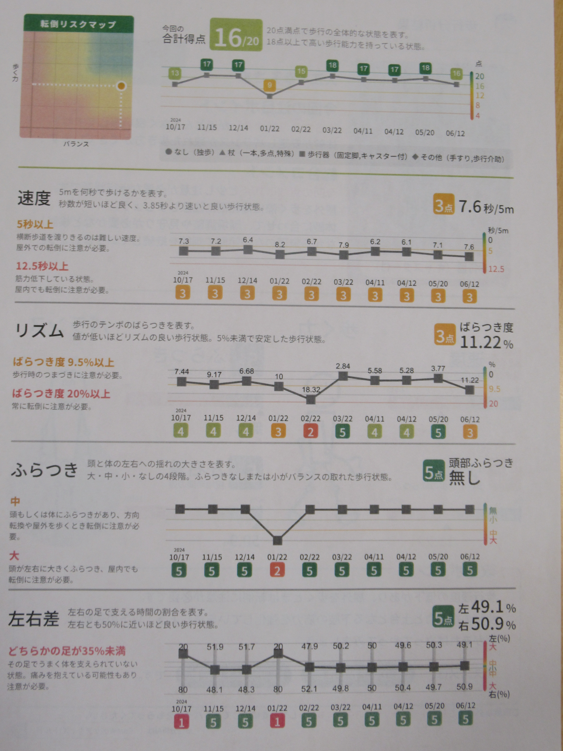 白金の森デイサービスでは、まずAIによる歩行状態分析ツール「トルト」を利用し、毎月出されるレポートをもとに現状を把握。分析結果の「改善ポイント」として挙げられた「おすすめ運動」を個別に取り入れることで、より効果的なリハビリを計画的に行っています。