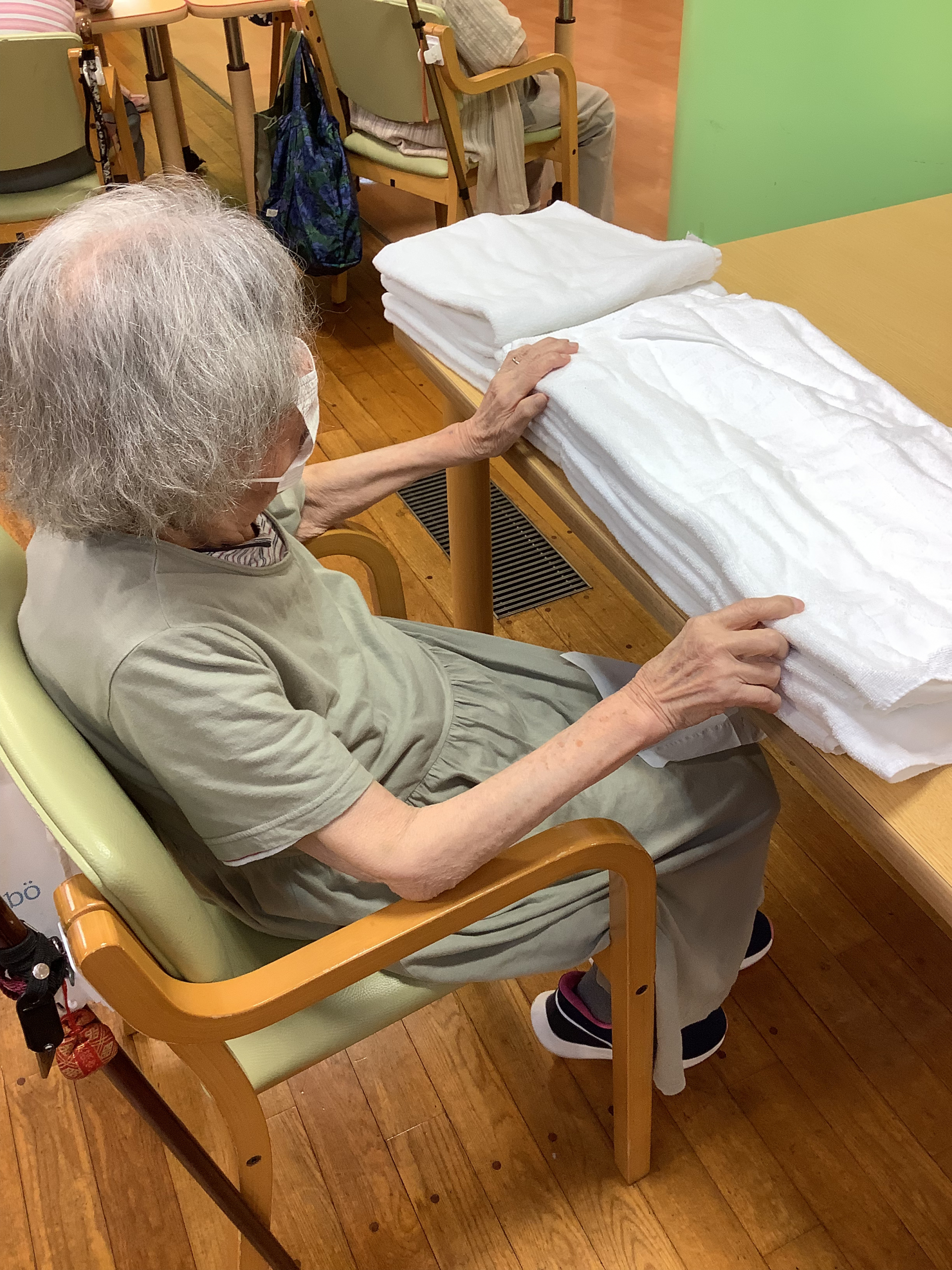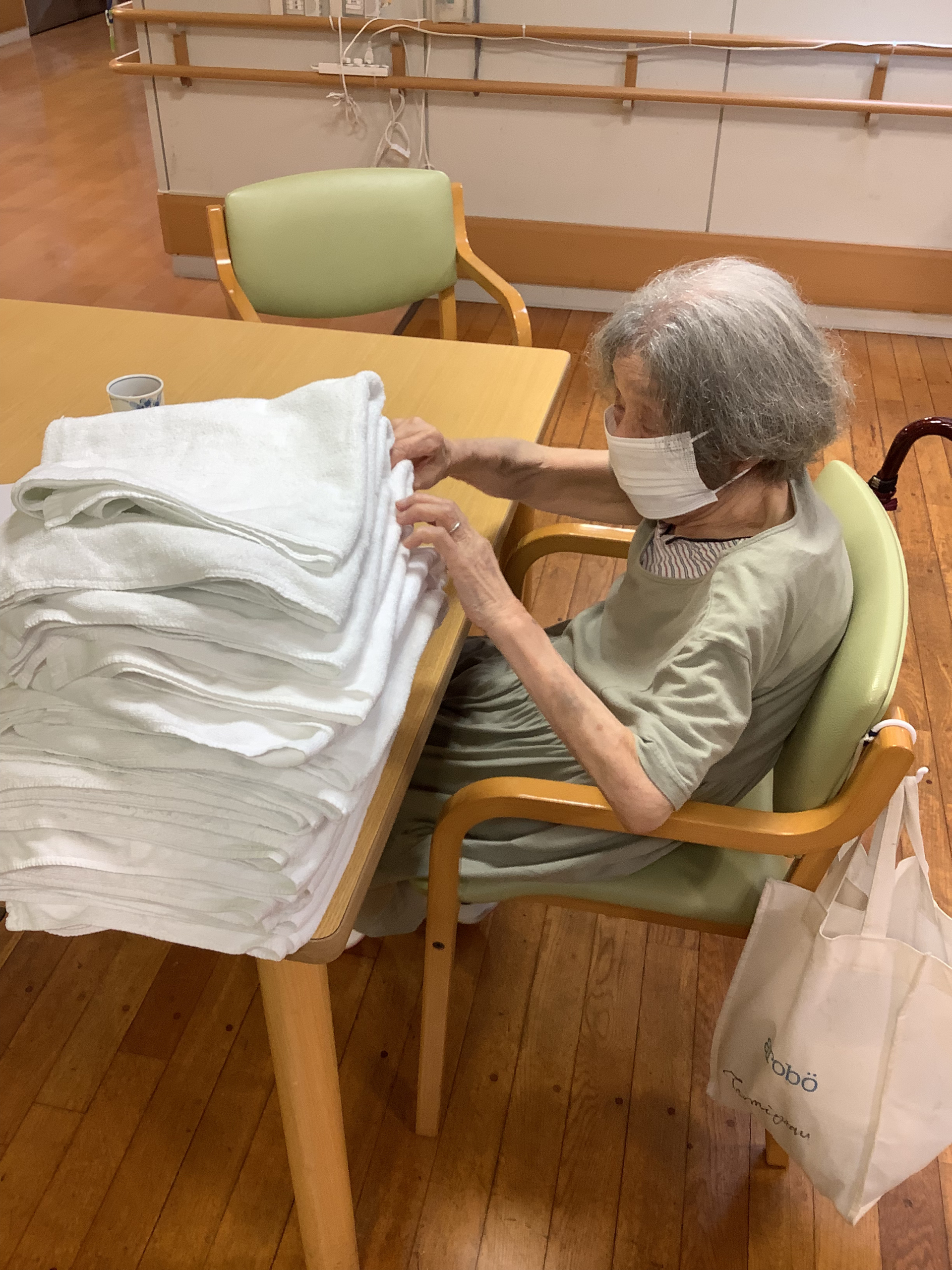 こちらのご利用者は、クリーニングされたバスタオルを半分に畳む工程に励んでいます。