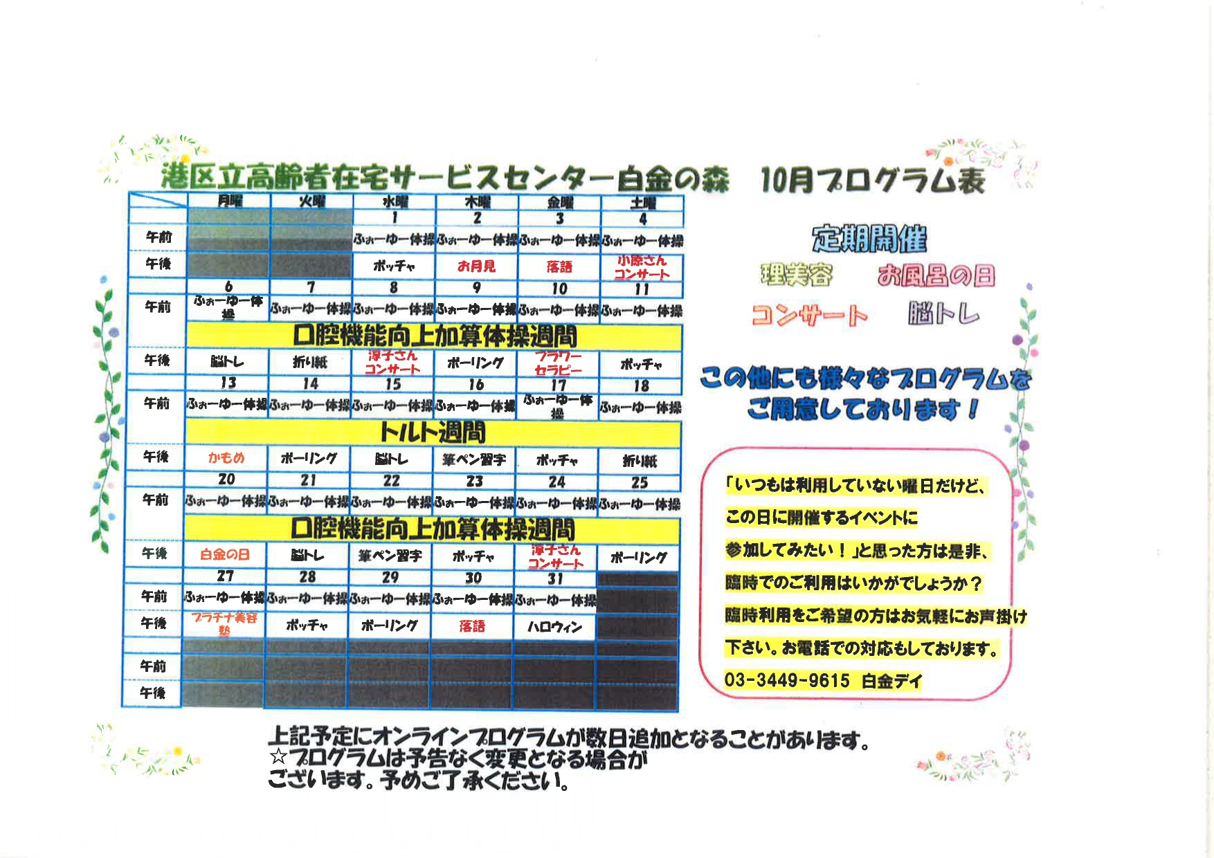 2025.10.01 お知らせ 10月のプログラム表 Tweet シェアする 10月のプログラム表を配布しました! #奉優会 #レクリエーション #福祉 #イベント #プログラム表 前の記事 2025.10.01 お知らせ 10月の献立表 次の記事 2025.10.01 お知らせ 10月の広報誌 一覧へ戻る