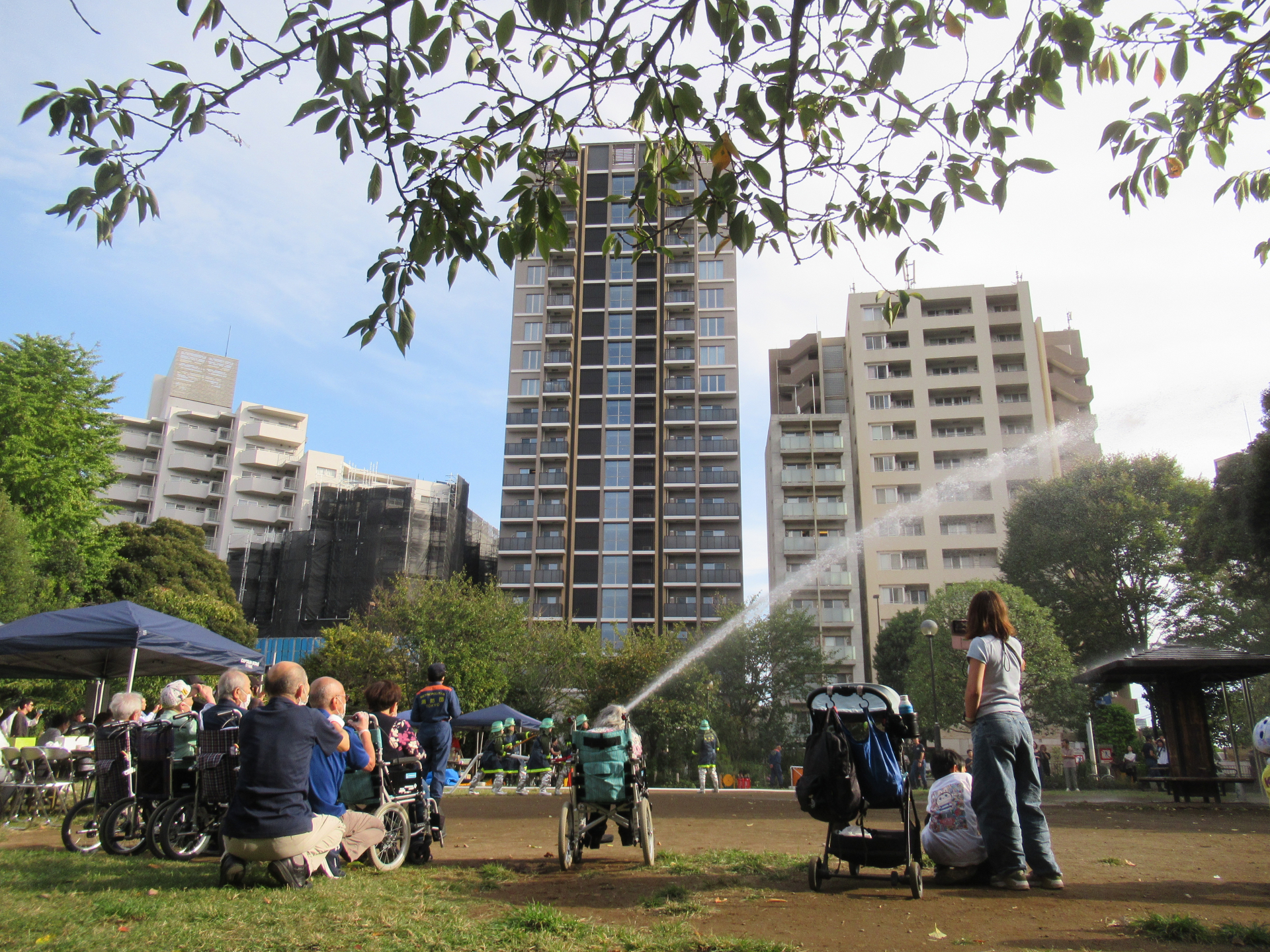 綱引きのあとは、消防団員さんによる放水訓練を目の前でご覧になり