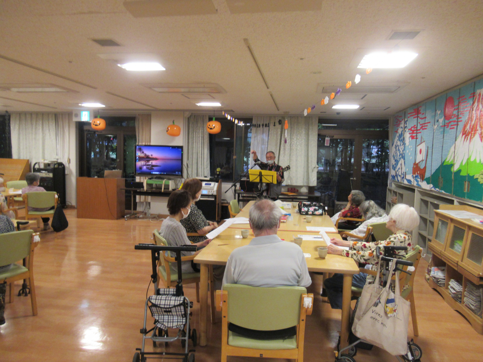 ハロウィンの飾り付けが進む白金の森デイサービスのフロアには、懐かしのヒットソングが流れると、ご利用者のみなさんも一緒に口ずさんだり、リズムを取ったりと、思い思いに楽しんでらっしゃいました☆