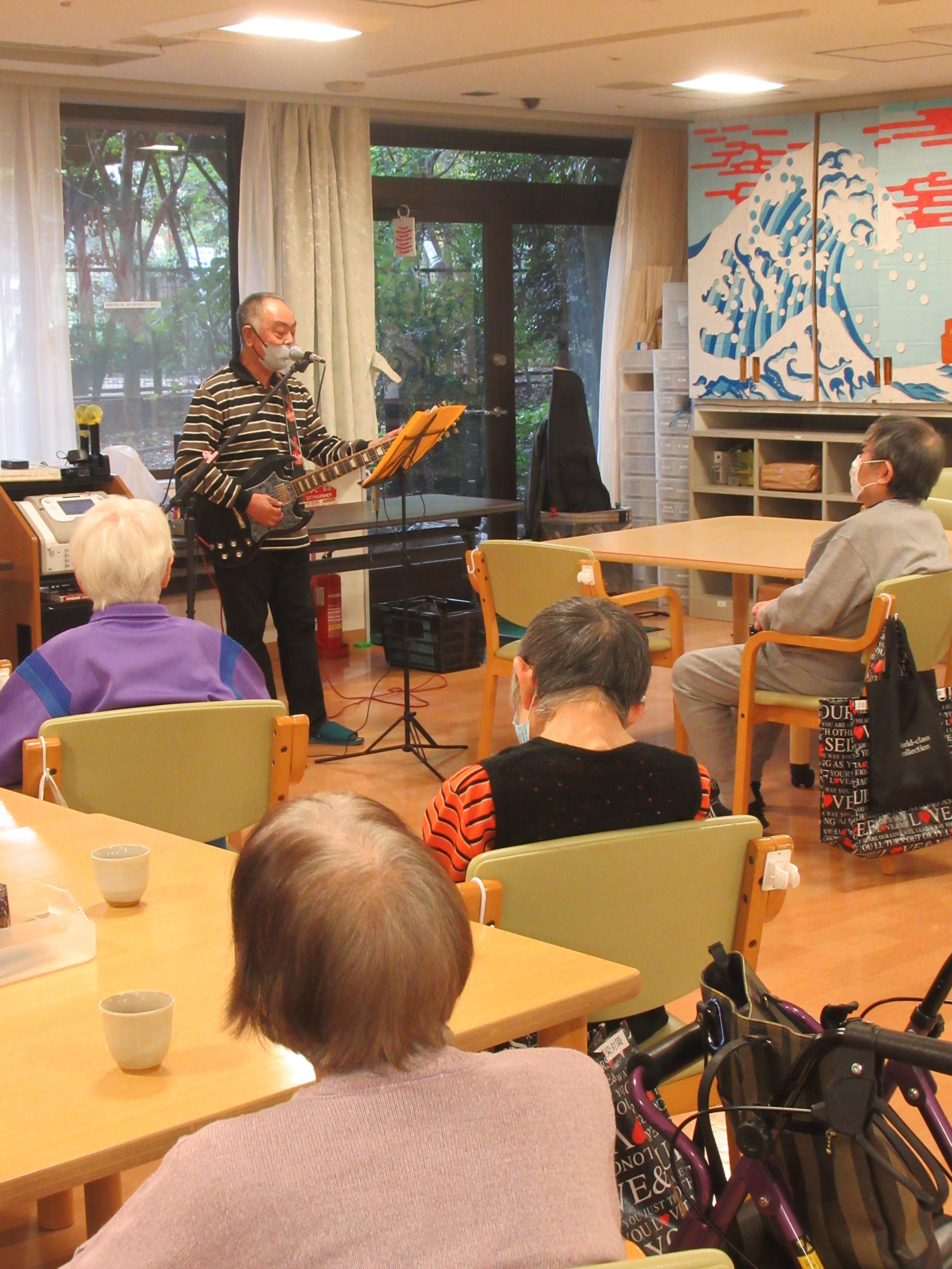 本日白金の森デイサービスにいらっしゃったのは、ボランティア・小原さん。今日もエレキギターの生演奏に乗せ、懐かしの歌謡曲をたくさん届けてくださいました☆