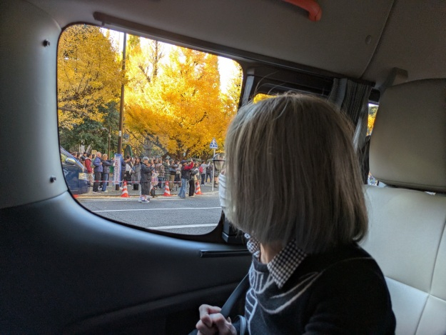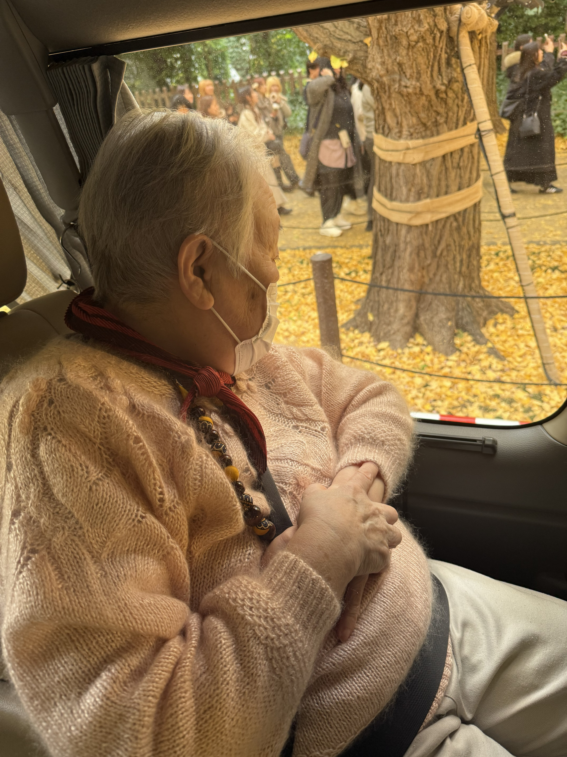 送迎車は車高が少し高いので、黄色い落ち葉が積もった歩道を上から眺められます。