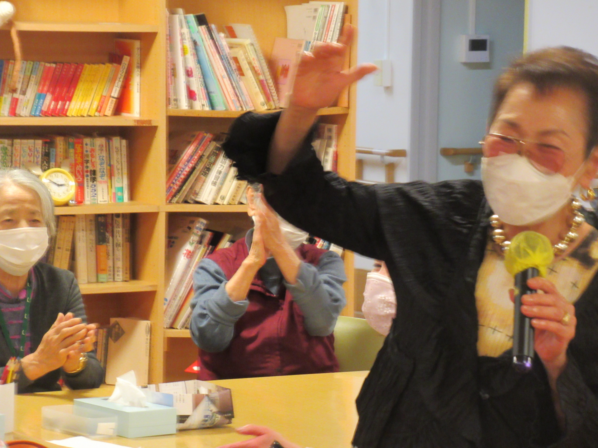 アンコールでのこと。淳子さんが越路吹雪さんの『サン・トワ・マミー』歌ってるとき、「私この歌が大好きだったの!うれしい!!」と歓声が上がりました。これには淳子さんも大興奮。ご利用者とふたり視線を合わせて、『サン・トワ・マミー』を熱唱してくださいました☆