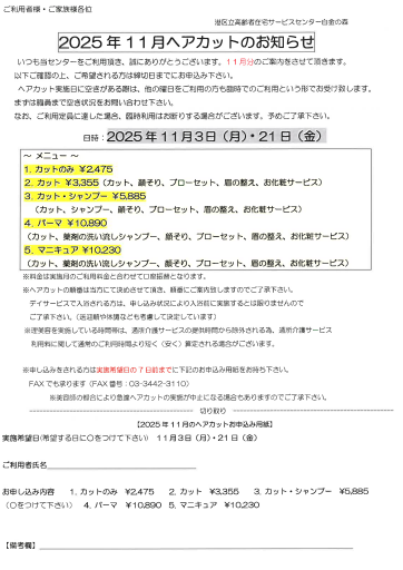 2025.11.01 お知らせ 11月イベントのお知らせ Tweet シェアする 11月イベントのお知らせを配布いたしました。 #港区 #白金の森デイサービス #イベント #紅葉ドライブ #ケーキバイキング #運動会 #11月お知らせ 前の記事 2025.11.01 お知らせ 11月のヘアカットのお知らせ 次の記事 2025.11.01 お知らせ 11月の広報誌 一覧へ戻る